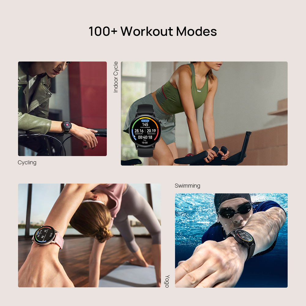【100+ Workout Modes】Supportingmore than 100 sports modes like running, cycling, hiking, swimming, jumpingrope and skiing. Whether you're dipping in the pool or sweating it out on thefield, you can enjoy your workout to the fullest. You can also use the watch toplay music.