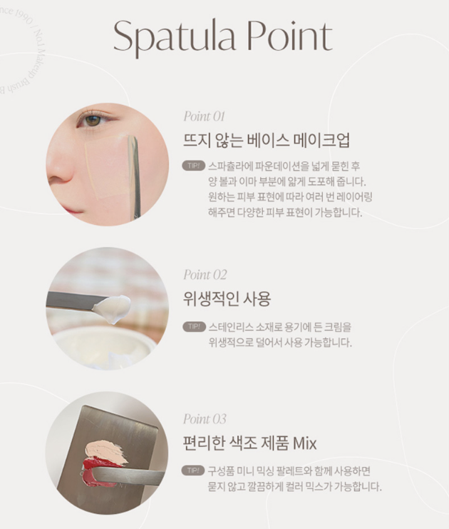 • Apply the product at a 90-degree angle on the corner of the spatula and spread it thinly on the desired area, and use a sponge or brush to adhere to the skin. After using the spatula, wipe it clean and store it in the case