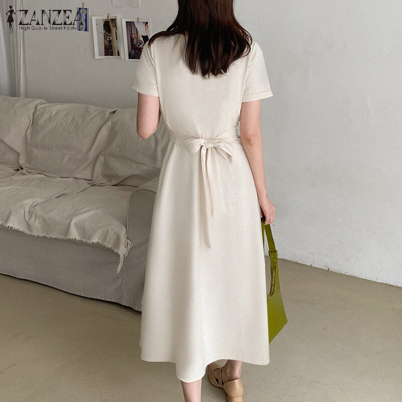 ZANZEA Korean Style Women Elegant Plain V Neck Tunic Dress Short Sleeve OL Midi Dresses #10