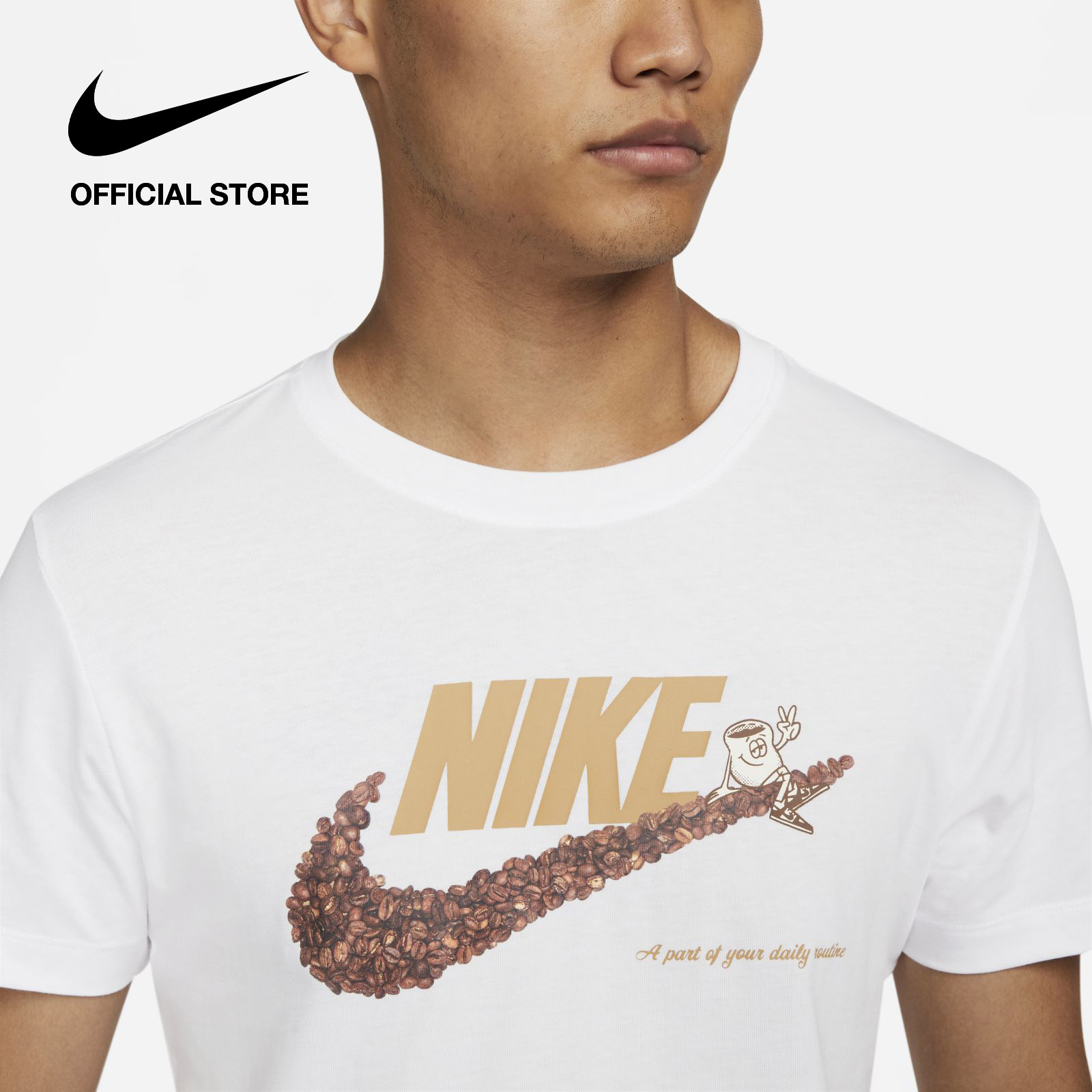 Rise and grind with the Swoosh and keep your style as fresh as your coffee beans. Made with our soft, lightweight cotton in a relaxed fit, this tee keeps it casual and comfy all day. Printed cafe-inspired graphics get you going in the morning.