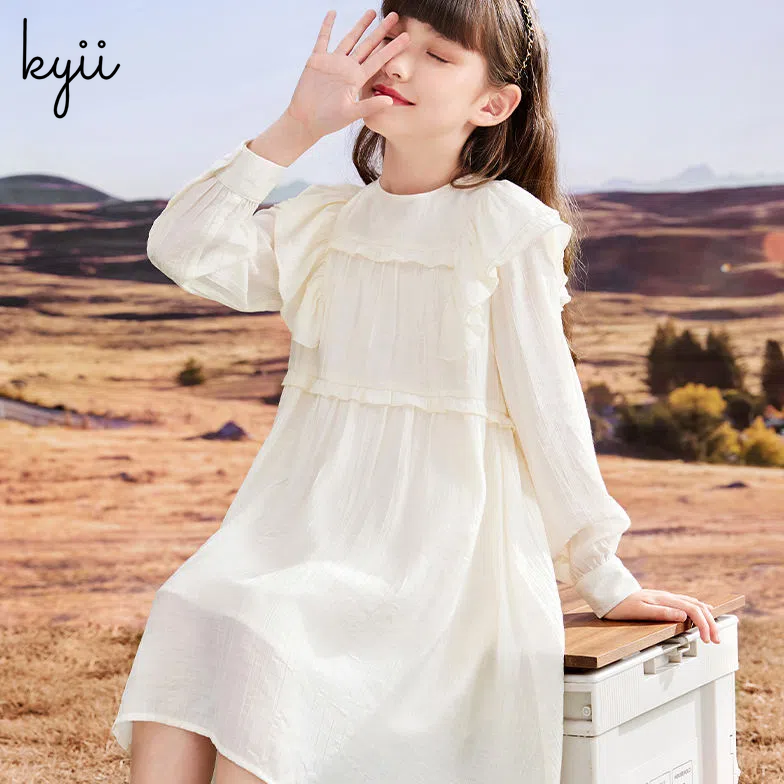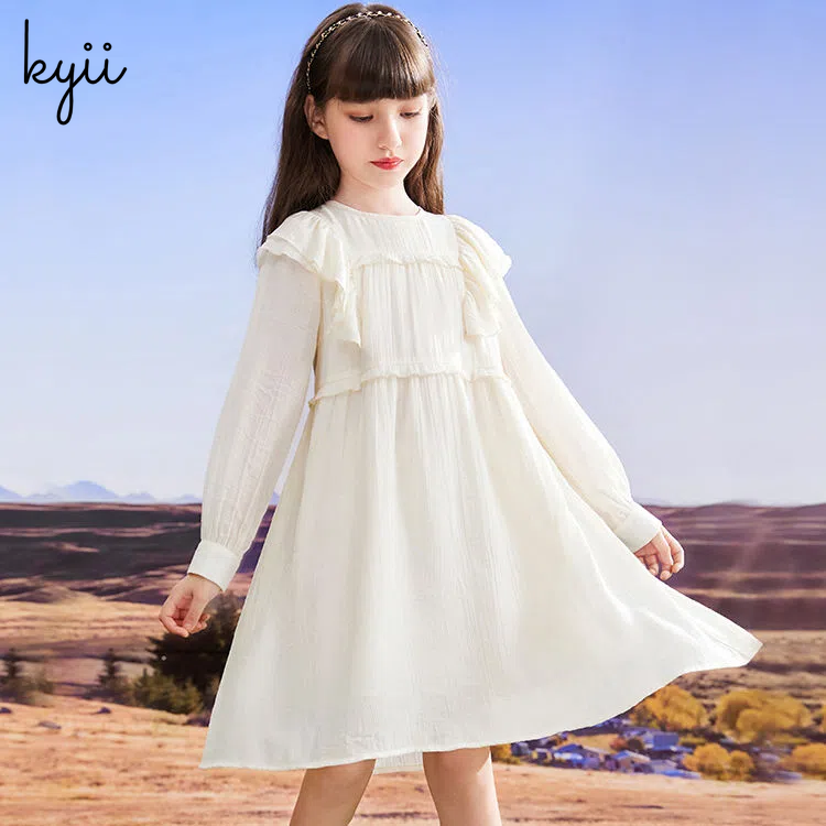 KYII Kids Girls Summer Round-neck Dress Casual Loose Long Sleeve Dress kyii0046