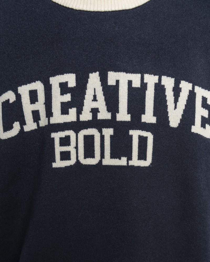 Regular Knitted Round Neck Varsity Vest With Asymmetrical Contrast Coloured Neckline and Hem. Comes with CREATIVE BOLD Slogan at the front. Made of cotton.