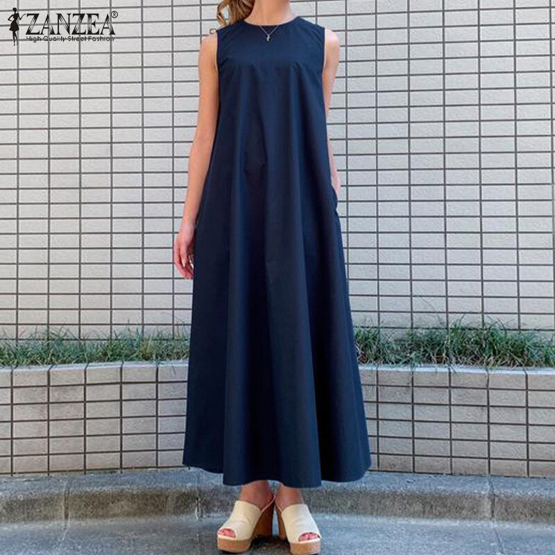 ZANZEA Korean Style Women's Dresses Vintage Sleeveless A-Line Loose O-Neck Maxi Tank Sundress #8