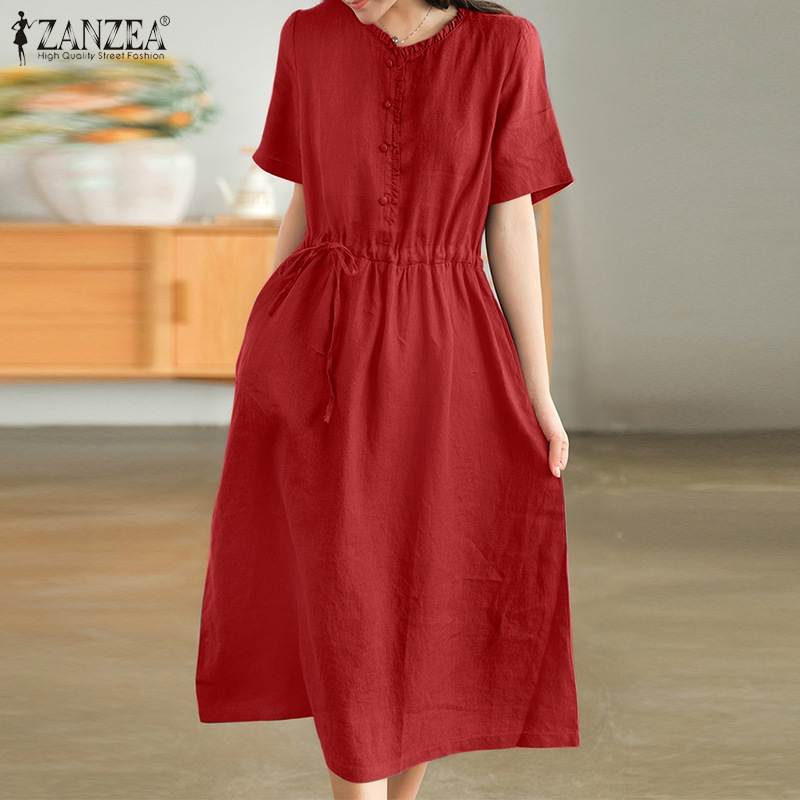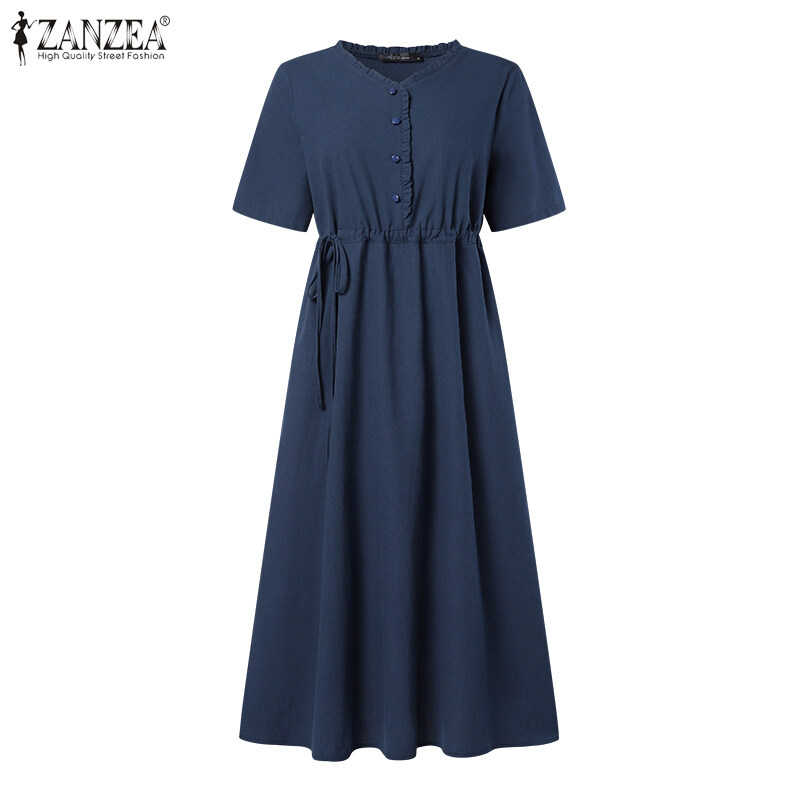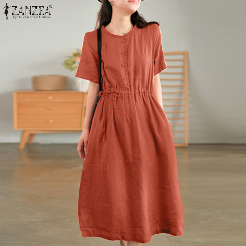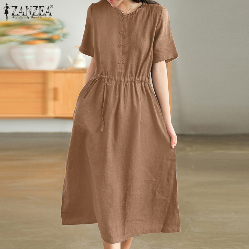 ZANZEA Korean Style Women Short Sleeve A Line Long Dress Cotton Linen Plain Oversized Swing Dresses #8