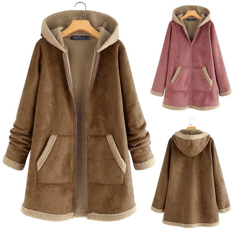ZANZEA Womens Winter Warm Hooded Fleece Trench Coats Hoodies Zip Up Outwears
