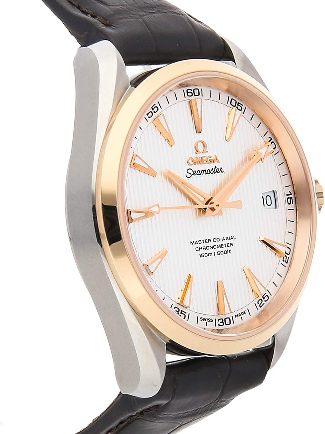 Omega Seamaster Aqua Terra 150m (23123422102001) self-winding automatic watch features a 41.5mm stainless steel case with an 18k rose gold bezel surrounding a silver Teak dial on a brown alligator strap with a stainless steel deployant buckle. Functions include hours minutes seconds and date. This watch comes with box and papers. Majority of time remaining on the factory warranty!